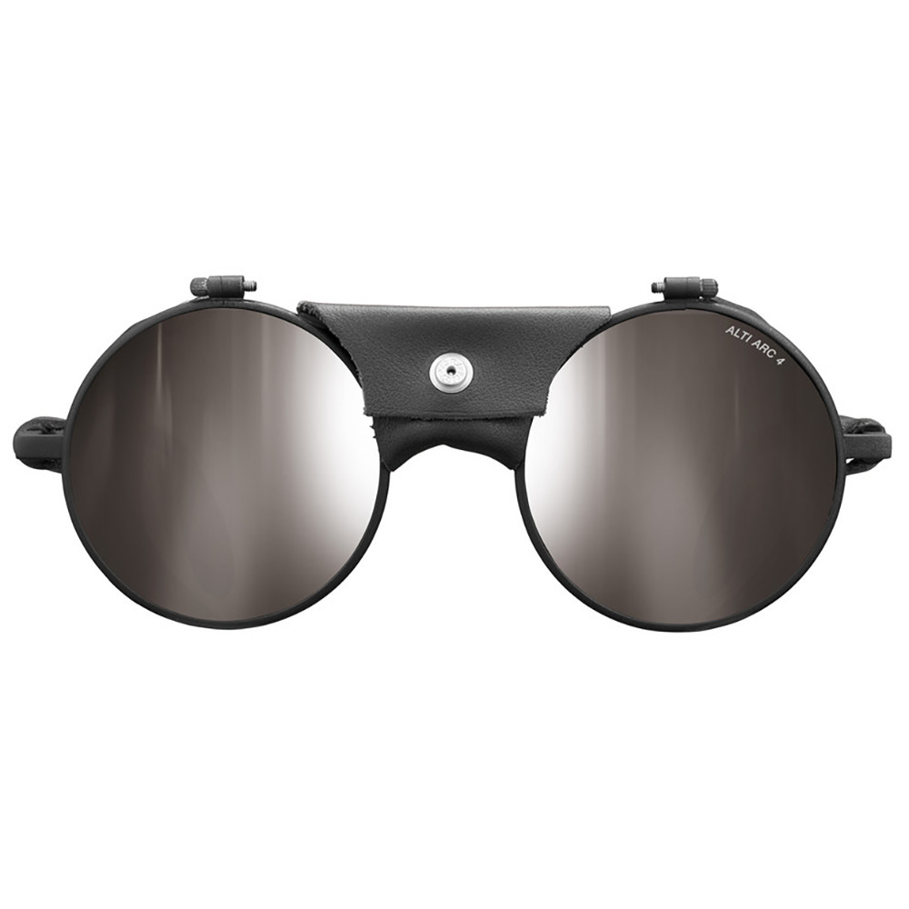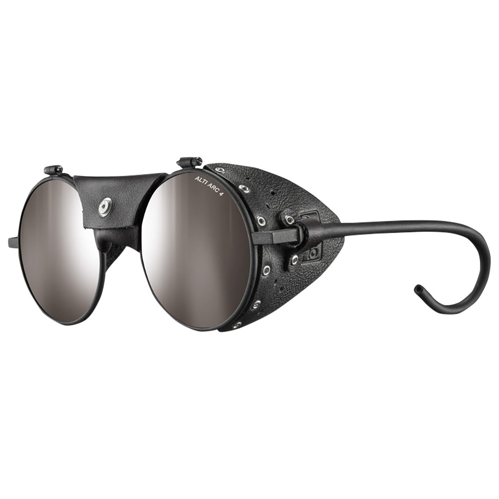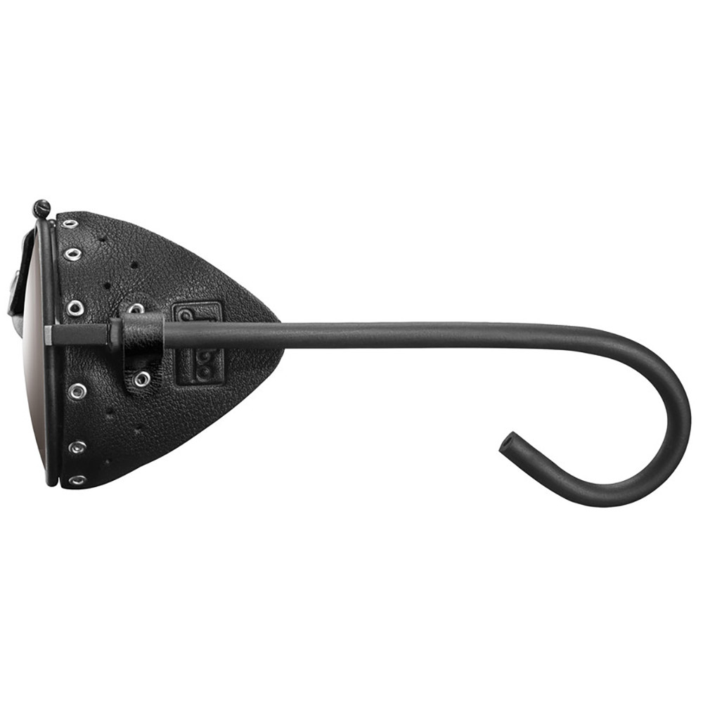 Okulary przeciwsłoneczne w stylu Glacier z okrągłymi soczewkami, elastycznymi bokami za uszami i skórzanymi bokami. Soczewki z 4 filtrami przeciwsłonecznymi chronią oczy i przepuszczają 5% światła widzialnego. Oczy są również chronione z boku.