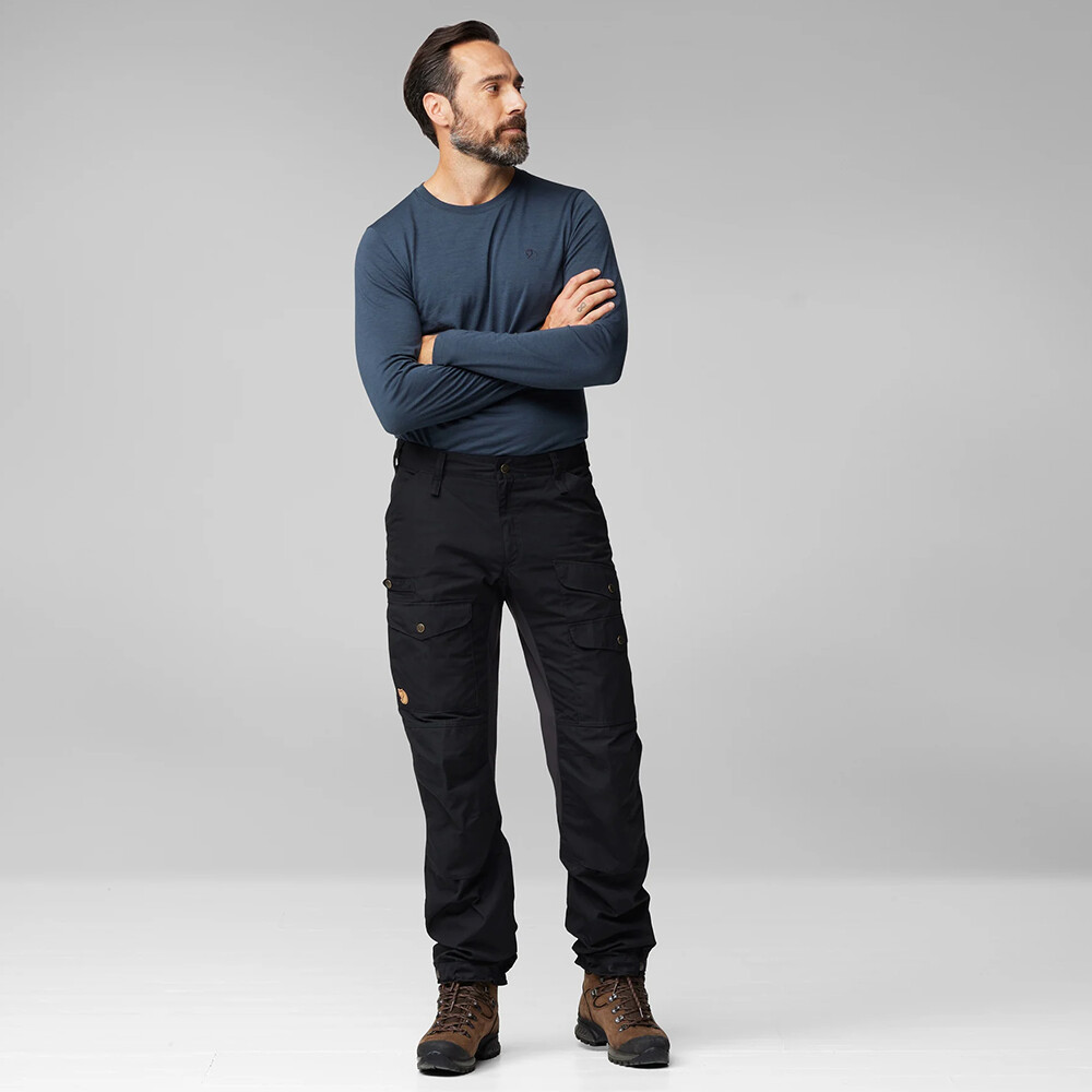 Męskie spodnie turystyczne Fjällräven z materiału G-1000 Eco, który może być woskowany dla zwiększenia trwałości. Klasyczny krój z dużą ilością kieszeni zapewni wygodę i uprzyjemni wędrówki. Wstępnie ukształtowane kolana można uzupełnić o nakolanniki.