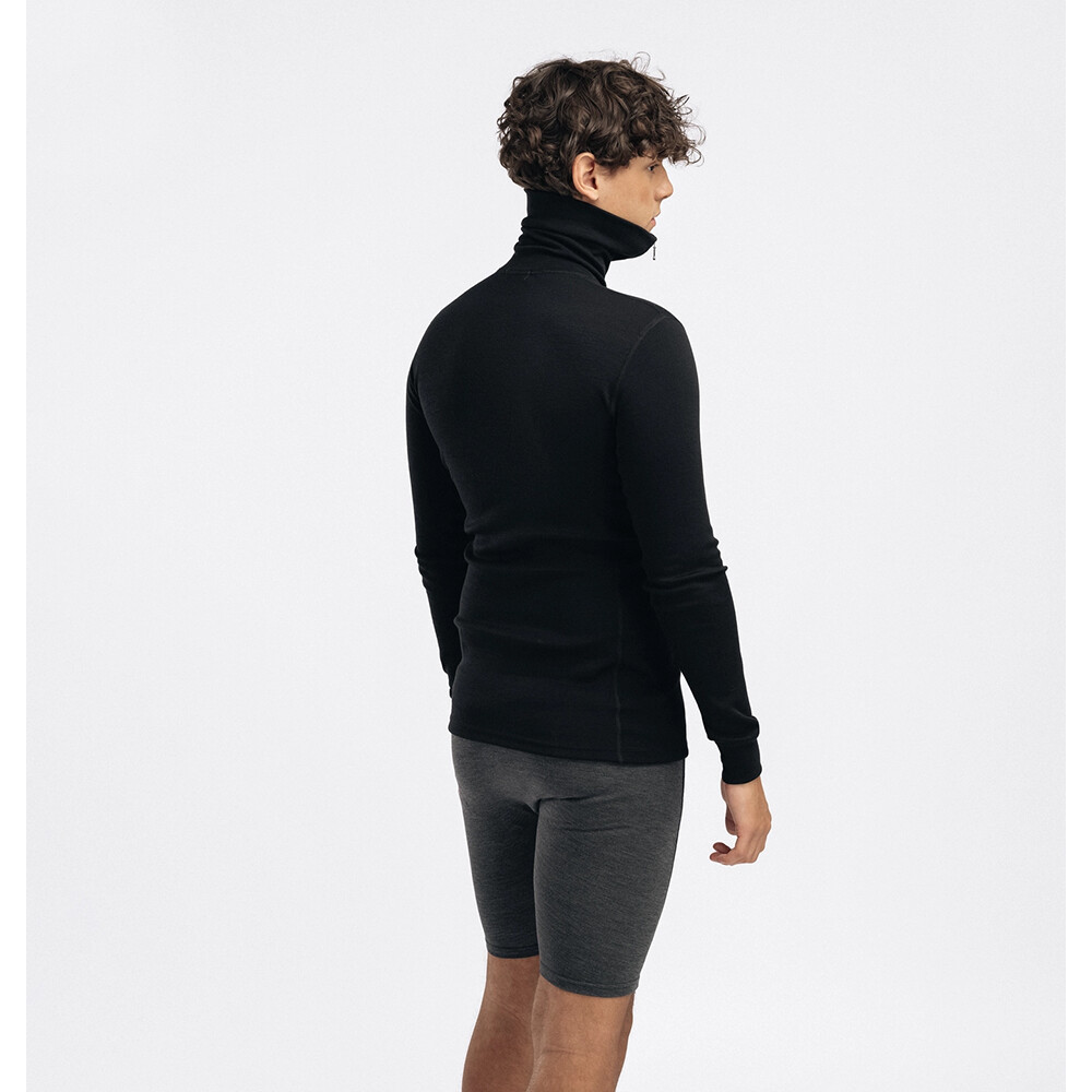 Męska wełniana koszulka ze stójką utrzymuje ciepło wokół szyi. Wełna merino jest ciepła, elastyczna i reguluje temperaturę ciała w zależności od potrzeb. Koszulki można używać jako pierwszej lub drugiej warstwy.
