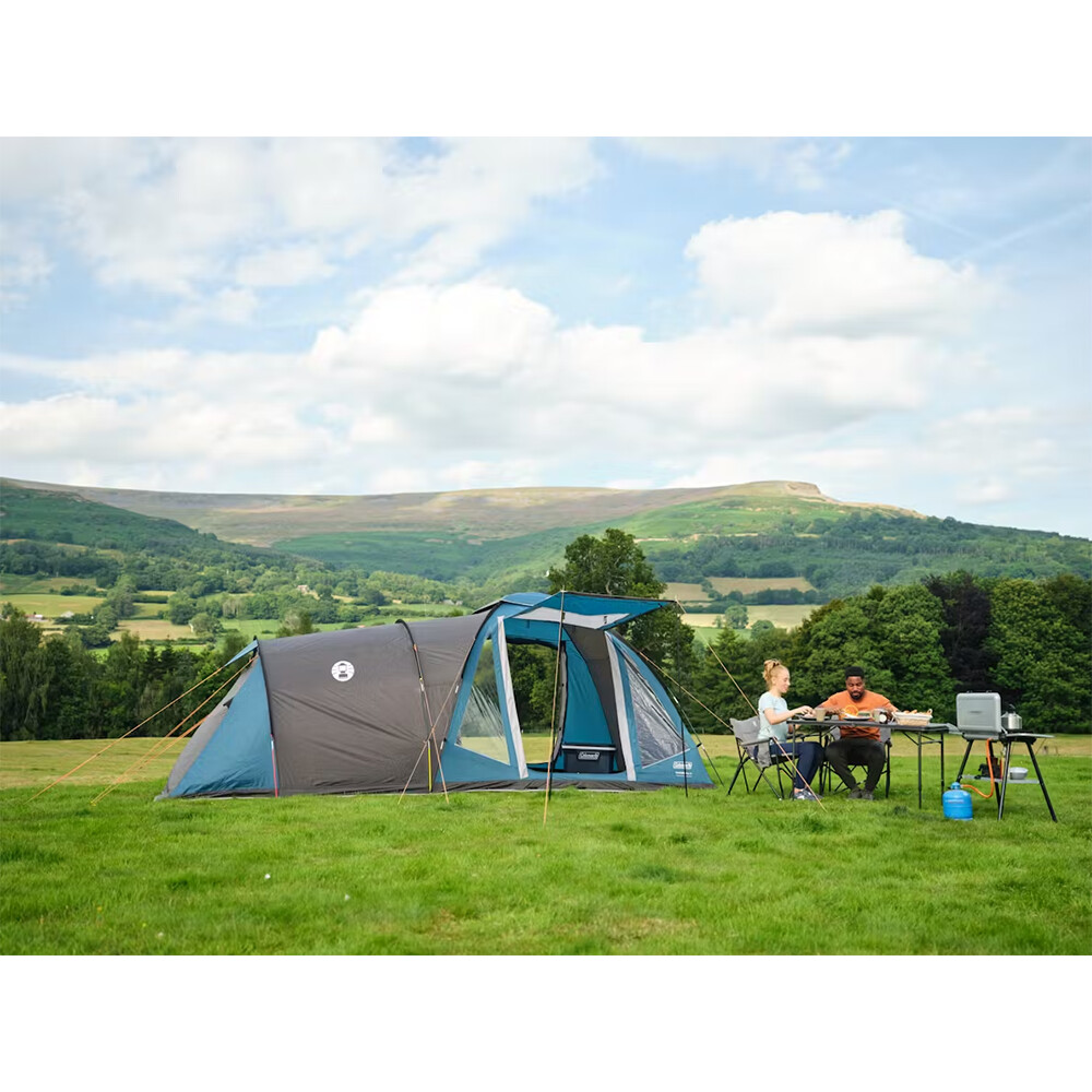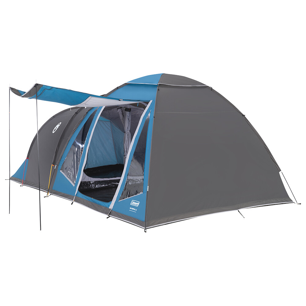 Waterfall 5 firmy Coleman to namiot odpowiedni na kemping dla rodziny lub grupy przyjaciół. Jego kształt łączy konstrukcję tunelową i kopułową. Oferuje przestronny przedpokój o wysokości 165 cm i sypialnię, w której może spać do pięciu osób. Przedpokój ma dwa duże okna PCV, które wpuszczają dużo światła, a także mają opcję zaciemnienia. Drzwi namiotu można wykorzystać jako markizę z dwoma stalowymi słupkami, aby zapewnić zacieniony obszar przed namiotem, idealny do umieszczenia stołu kempingowego i krzeseł. Co ciekawe, na zewnątrz wejścia znajdują się również otwory do przeciągnięcia kabli elektrycznych, a wewnątrz namiotu duże kieszenie do przechowywania drobnych przedmiotów, takich jak lampa, przybory toaletowe i inny sprzęt.