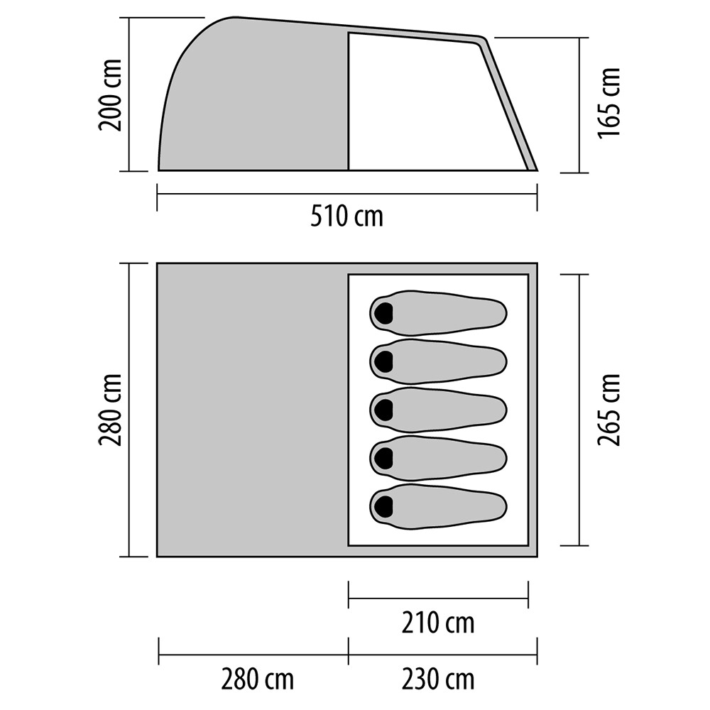Namiot dla czterech osób. Posiada dwie oddzielne sypialnie i dwa wejścia, które można otworzyć jako markizę. Technologia blackout (zaciemnienie sypialni) chroni przed światłem dziennym i pozwala na dłuższy sen.