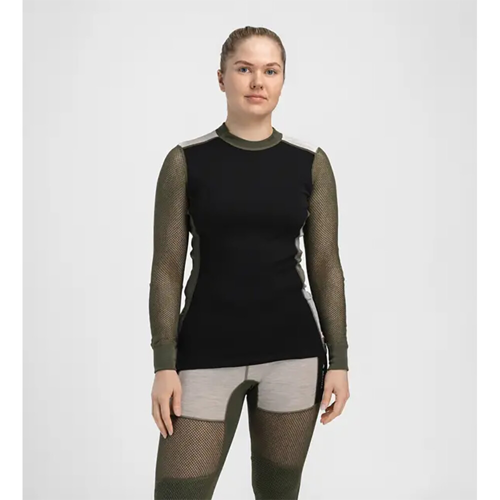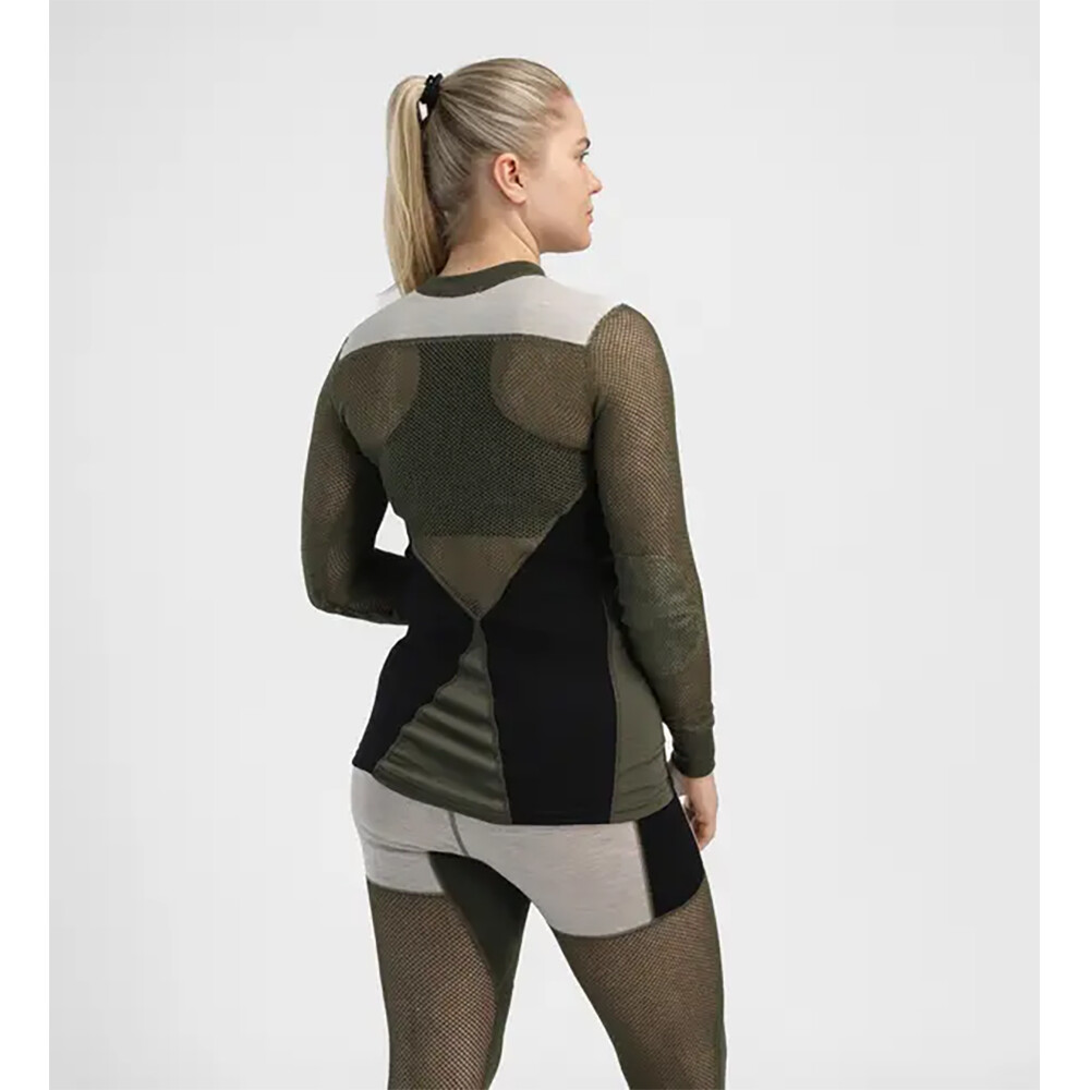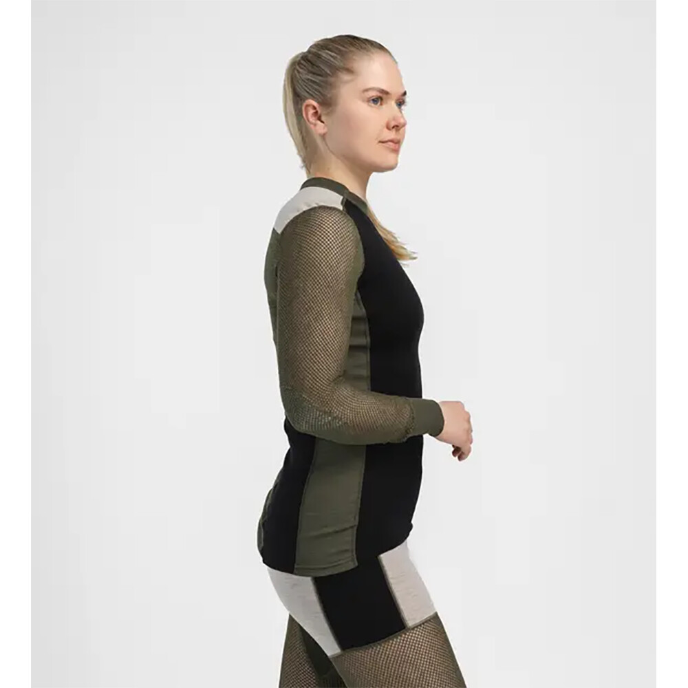 Koszulka WoolNet Hybrid Crew Neck Women's Round Neck, Long Sleeve Mesh Shirt posiada wzmocnienia na łokciach i prążkowaną dzianinę na ramionach, aby chronić przed dyskomfortem związanym z paskami na ramię plecaka i ogólnym zużyciem. Koszulka jest odpowiednia do wszystkich aktywności o wysokiej aktywności, od wędrówek alpejskich zimą, długich wędrówek górskich, trudnych i mniej wymagających wędrówek i wypraw po polowanie i wędkarstwo.