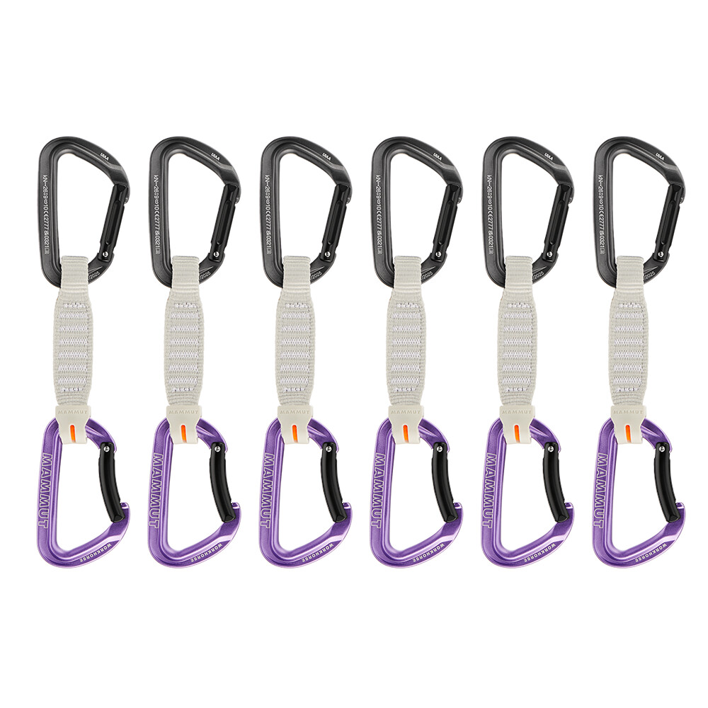 Zestaw sześciu karabinków ekspresowych Mammut, które składają się z mniejszych i lżejszych karabinków Sender. Karabinki dobrze się zatrzaskują dzięki kluczowemu zatrzaskowi na zamku, a szersza taśma zapobiega załamywaniu się liny.