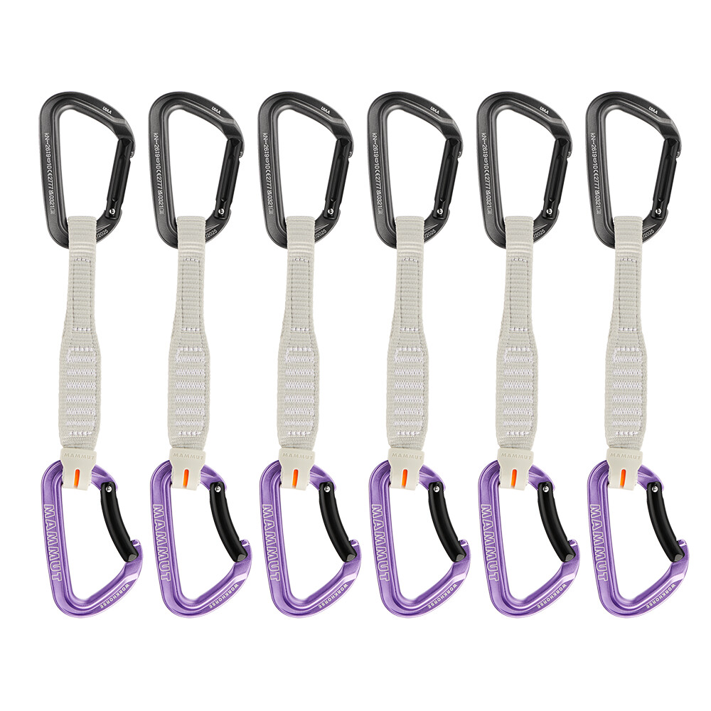 Zestaw sześciu karabinków ekspresowych Mammut, które składają się z mniejszych i lżejszych karabinków Sender. Karabinki dobrze się zatrzaskują dzięki kluczowemu zatrzaskowi na zamku, a szersza taśma zapobiega załamywaniu się liny.