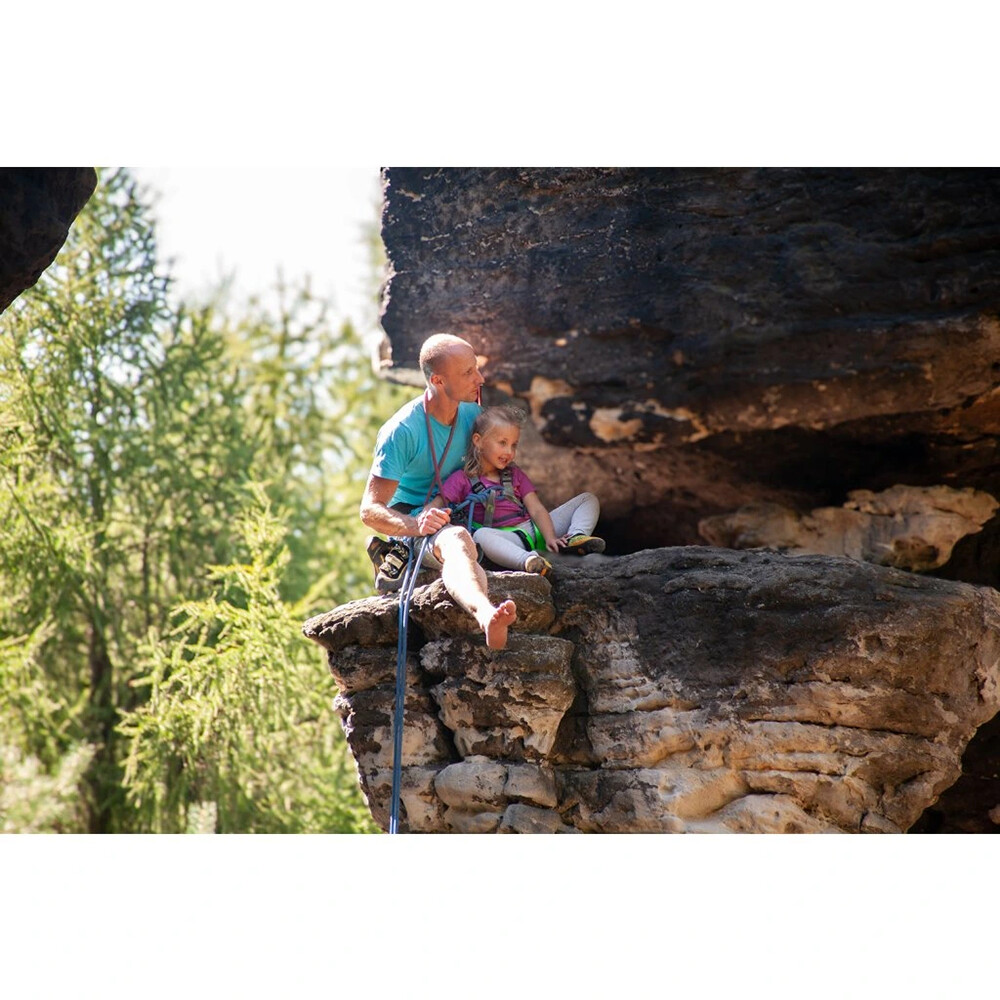 Uprząż na całe ciało powinna być zawsze używana przez młodsze dzieci. Dotyczy to zarówno wspinaczki, jak i na przykład ferraty. Nie zapomnij o kasku! Do łączenia punktów asekuracyjnych używaj certyfikowanego karabinka z blokadą (EN 362) lub przywiąż dziecko bezpośrednio do liny węzłem ósemkowym. Postępuj zgodnie z instrukcjami producenta.